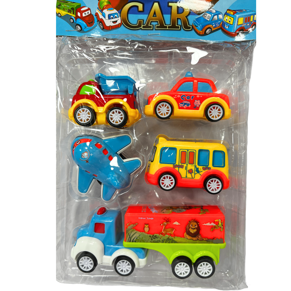 Includes 5 toy vehicles: Car, Bus, Airplane, Truck, and Fire Rescue Car